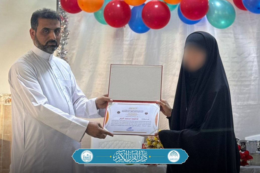 وشهد الحفل تكريم المشاركات بشهادات تقديريّة وهدايا رمزيّة، إضافة إلى تكريم الثلاثة الأوائل من قبل مسؤول الفرع حسين البياتي، الذي أكّد في كلمته أهمية تعلّم القرآن الكريم وتعليمه، مستشهدًا بقول النبي الأكرم (صلى الله عليه وآله وسلم) "خيركم من تعلّم القرآن وعلّمه"، داعيًا المشاركات إلى أن يكنَّ قدوة في حمل رسالة القرآن ونشر تعاليمه.
