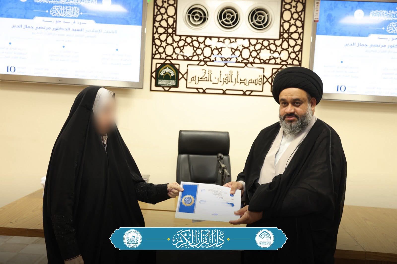 احتضنت بناية دار القرآن الكريم احتفاليّة مميّزة لختام دورتين نوعيتين، دورة " أسماء الله الحسنى وأثرها في الواقع النفسي والاجتماعي"، ودورة "مفاتيح إعراب القرآن الكريم " المستوى الثاني و تكريم الحافظات المشتركات في المسابقة التطويرية الثانية في حفظ القرآن الكريم، يوم الخميس (٢٣ تشرين الأول ٢٠٢٥) . وقال مسؤول مركز الإعلام القرآني وسام نذير الدلفي : "ركّزت الدورة الأولى على البعد الروحي والسلوكي للأسماء الإلهية، بينما أبحرت الدورة الثانية في تعميق الفهم النحوي واللغوي لكتاب الله العزيز، واستُهل الحفل بتلاوة عطرة لآيات الذكر الحكيم بصوت القارئ علي موسى، تلتها ندوة علميّة قدّمها مدير المعهد التخصصي لعلوم القرآن والحديث في النجف الأشرف السيد مرتضى الموسوي الذي تناول فيها أهمية التفاعل العميق مع النص القرآني". وأضاف الدلفي: "بعدها ألقت مشرفة الدورات الأستاذة آلاء ياسين عجام كلمة مؤثّرة أشادت فيها بالجهود المبذولة من قبل أستاذات الدورتين و الطالبات المشتركات مثمّنة عزيمتهن وإصرارهن على طلب العلم، وأكّدت على الدور المحوري لهذه الدورات في بناء جيل قرآني واعٍ مدرك لجماليات اللغة القرآنية وعمقها الروحي، وأعربت عن عميق الامتنان والتقدير لإدارة دار القرآن الكريم التي أضاءت دروب العمل برؤيتها الثاقبة، وحوّلت التحديات إلى فرص". وبيّن :"كما شهد الحفل لحظة فارقة تمثّلت في الإعلان عن إصدار كتاب "مفاتيح إعراب القرآن الكريم " وهو ثمرة جهود علميّة متراكمة ويعدّ إضافة نوعية للمكتبة القرآنية حيث يهدف إلى تيسير قواعد الإعراب للمتخصصين والمهتمين من طريق تطبيقها على النصّ المقدس وأحاديث وأدعية المعصومين (عليهم السلام )، كما تمّ عرض فيلم يبيّن ما موقف الإنسان في المحشر؟ كما تم تقديم فقرة مهارة إعراب القرآن الكريم" . واختتم الحفل بتكريم الأوائل وتوزيع الشهادات التقديرية على كافة المشتركات في هذه النشاطات اللاتي قدّمن شكرهن لدار القرآن الكريم على حسن الاستقبال وكرم الضيافة واختتم الحفل بقراءة دعاء الفرج .