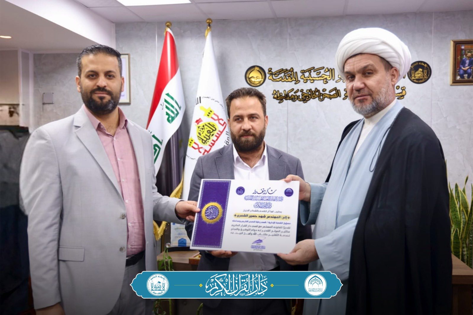 وفي ختام الزيارة، قدّم وفد قسم دار القرآن الكريم لوحةً فنية تذكارية إلى السيد محمد حسين الفتلاوي، تقديرًا لتعاونه ودعمه المتواصل لأنشطة القسم القرآنية.