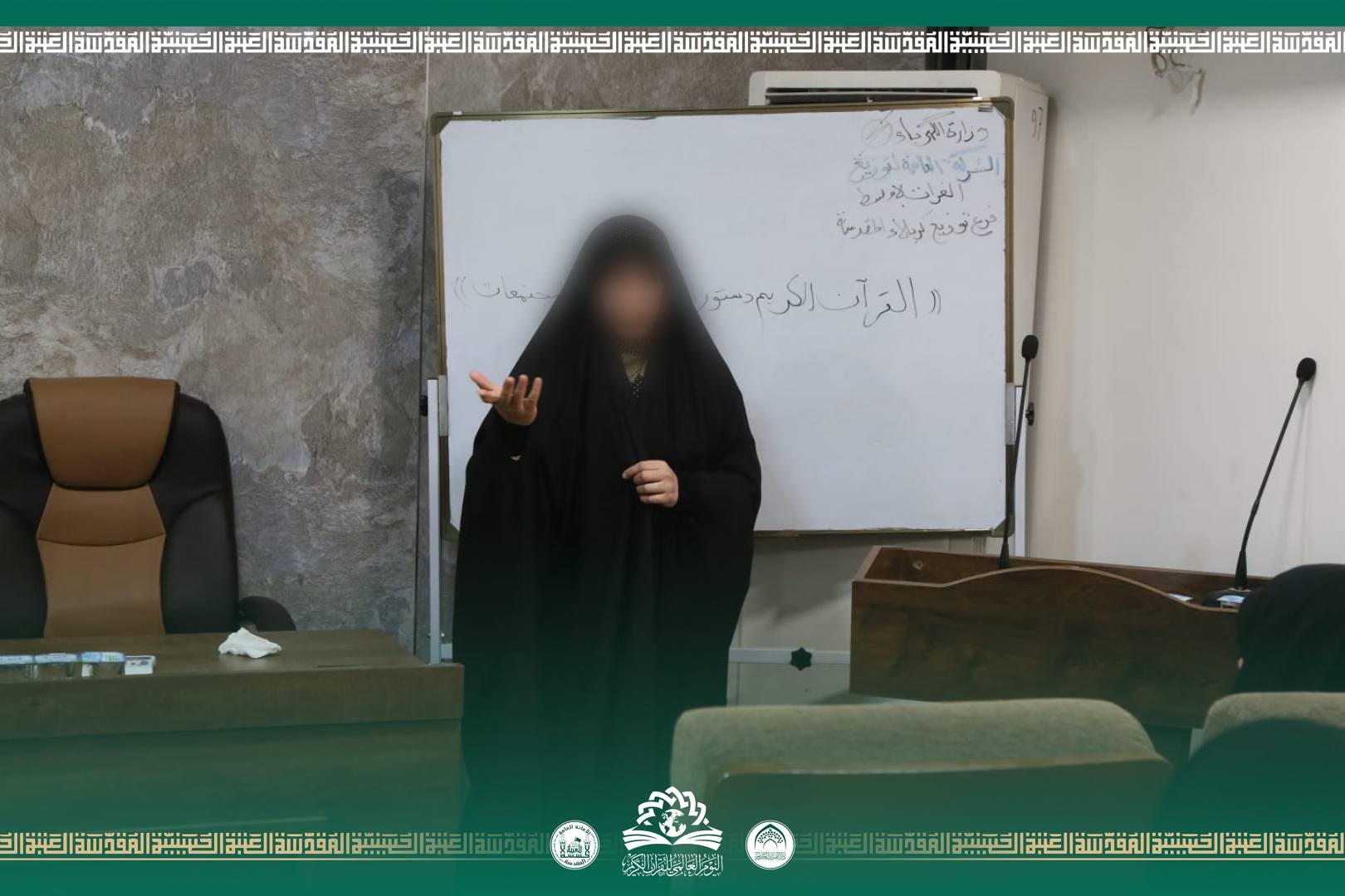 وقالت مسؤول وحدة النشاط القرآني النسوي أمل المطوري: "افتُتحت المحاضرة بتلاوة عطرة من آيات الذكر الحكيم، قدّمتها القارئة حوراء حيدر، تلتها فقرة عرض موجز لآيات الأخلاق في القرآن الكريم، مع التركيز على أخلاقيات العمل وأهمية ترسيخ بيئة قرآنية صالحة، تنطلق من إصلاح الفرد لنفسه بوصفه اللبنة الأولى في بناء المجتمع وإصلاحه".