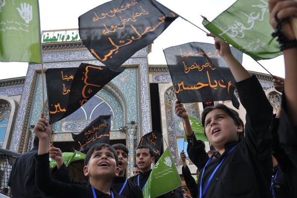 وردد المشاركون هتافات عاشوراء وكلمات رددها الإمام الحسين عليه السلام في معركة الطف سنة 64 هـ.