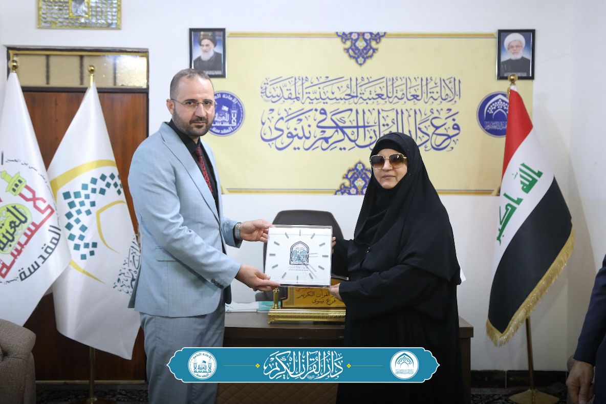 استقبل فرع دار القرآن الكريم في محافظة نينوى وفدًا من جامعة الزهراء (عليها السلام) في محافظة كربلاء ضمّ كلًا من "أ.د. زينب السلطاني رئيس الجامعة، و أ.د. زهير الأسدي مساعد رئيس الجامعة للشؤون العلمية، وأ.د. غيداء عبد الحسن عميد كلية الهندسة"،