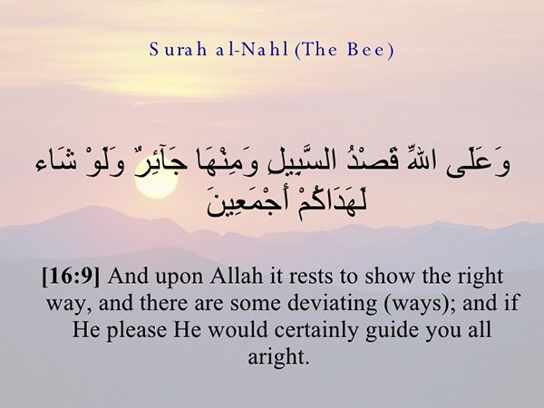 قال تعالى: {وَعَلَى اللَّـهِ قَصْدُ السَّبِيلِ وَمِنْهَا جَائِرٌ وَلَوْ شَاءَ لَهَدَاكُمْ أَجْمَعِينَ} ﴿ النحل - ٩﴾